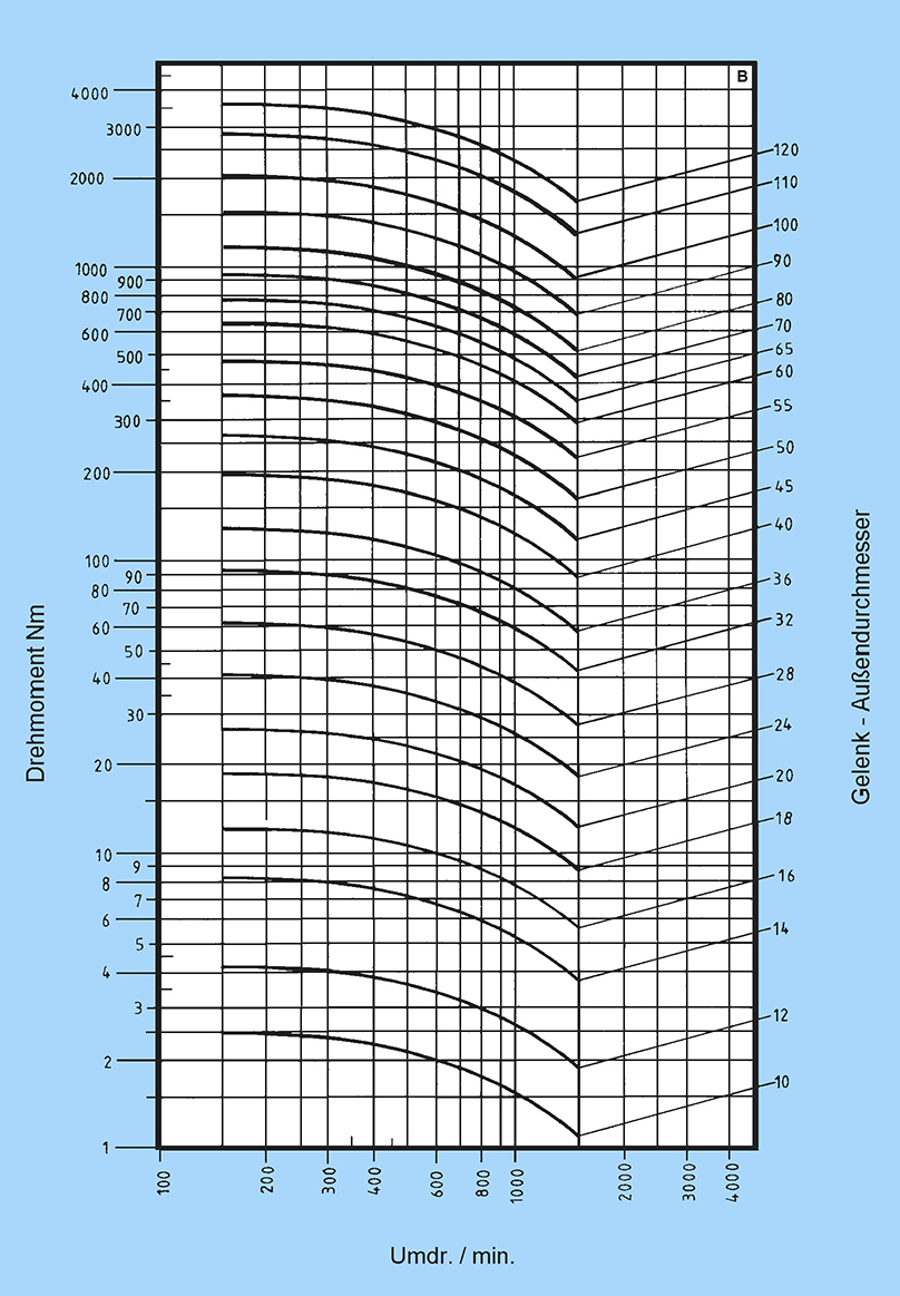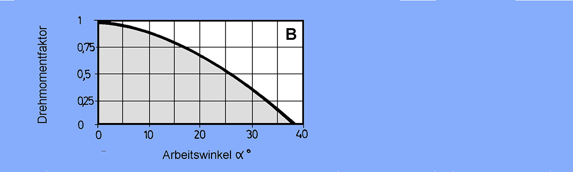 Bei größeren Winkeln verringern sich die übertragbaren Drehmomente. Den Korrekturfaktor entnehmen Sie bitte untenstehendem Diagramm. |