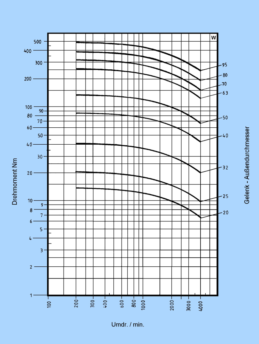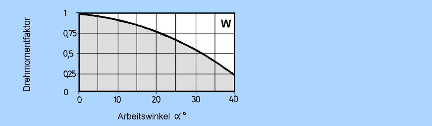 Bei größeren Winkeln verringern sich die übertragbaren Drehmomente. Den Korrekturfaktor entnehmen Sie bitte untenstehendem Diagramm. |